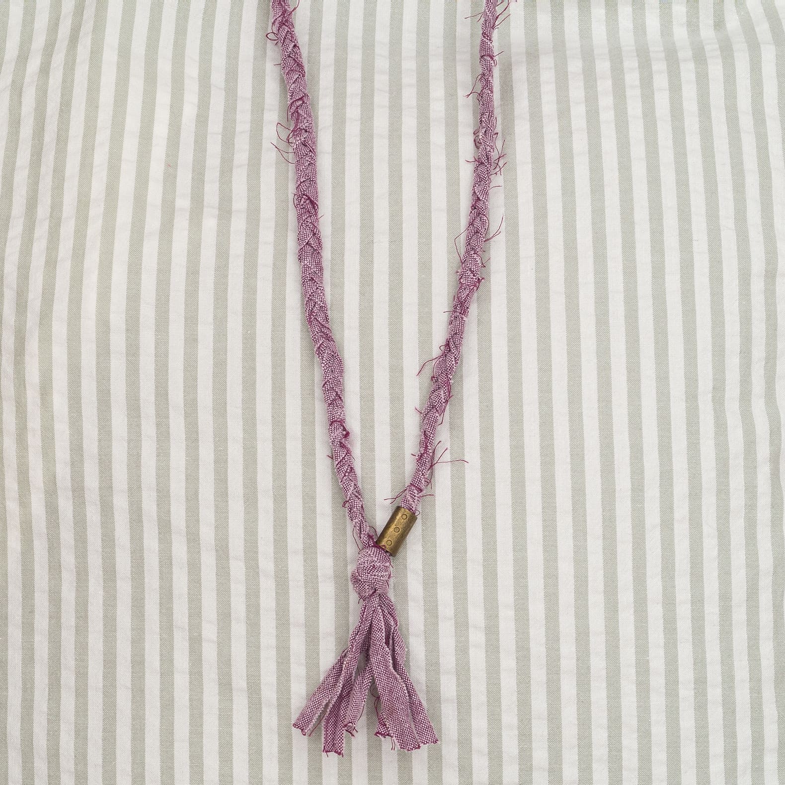 This necklace was hand-braided in Paris from a mauve chambray shirt. A brass ring, shaped and distressed by hand, is engraved with our signature three dots.