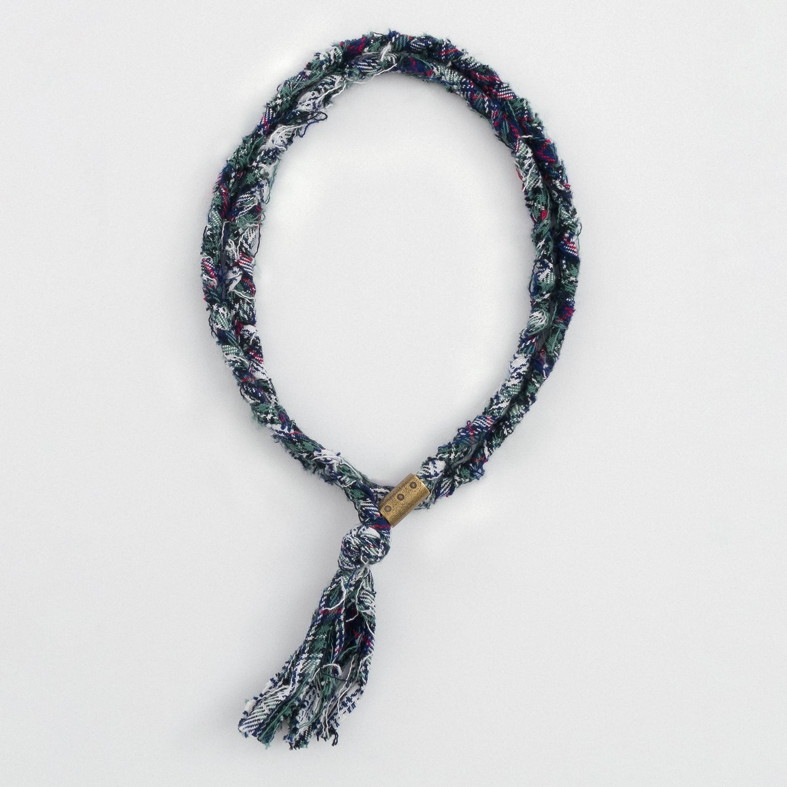 This necklace was hand-braided in Paris from a green, navy, white and red cotton flannel check shirt. The brass ring, shaped and distressed by hand, is engraved with our signature three dots.