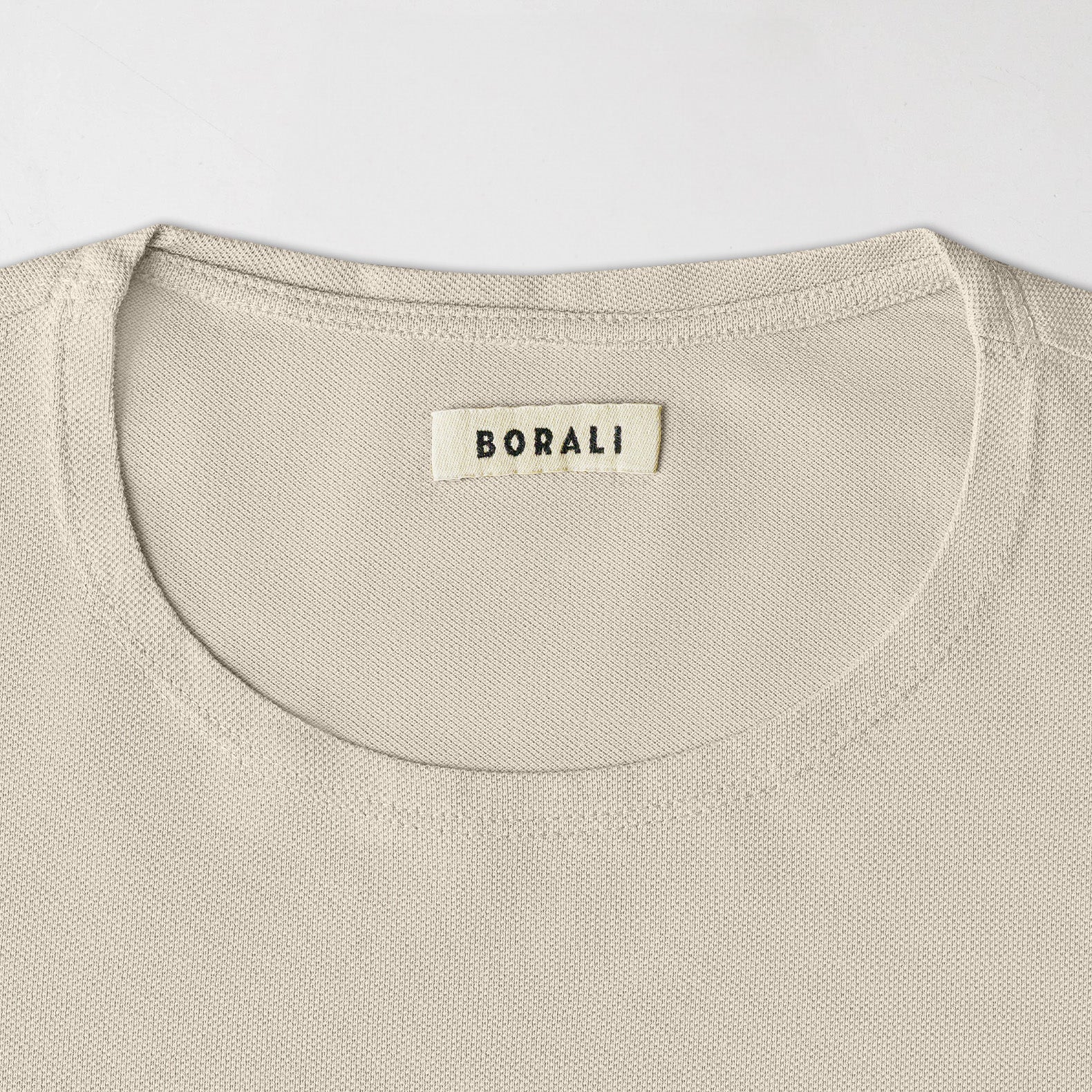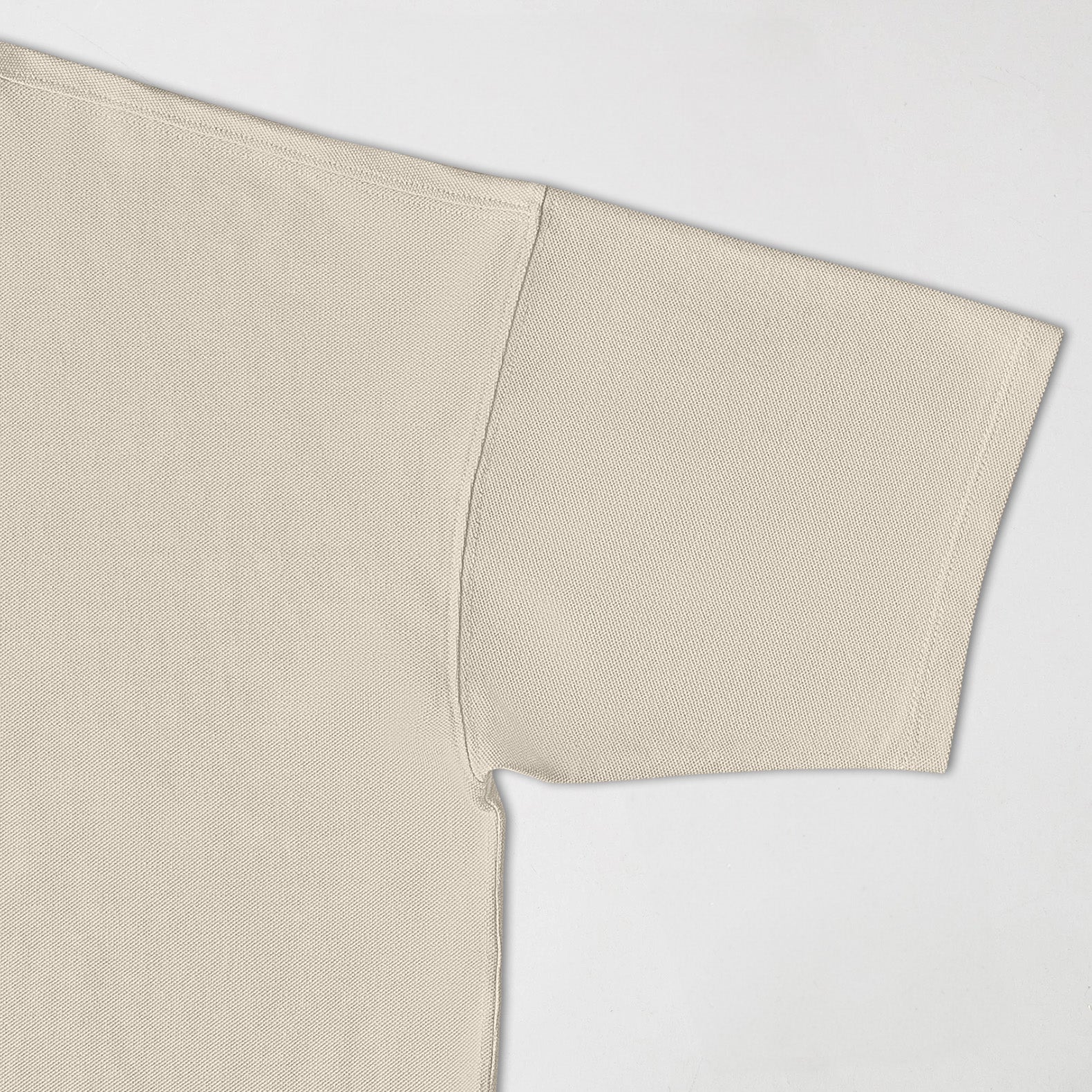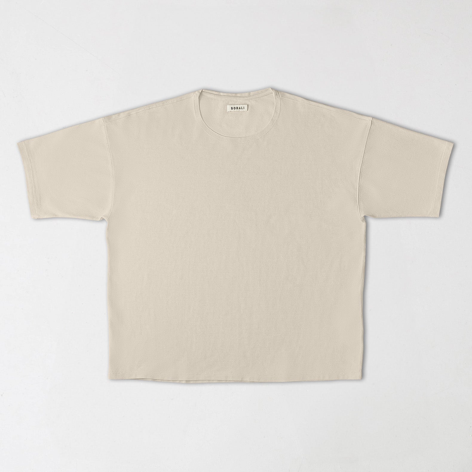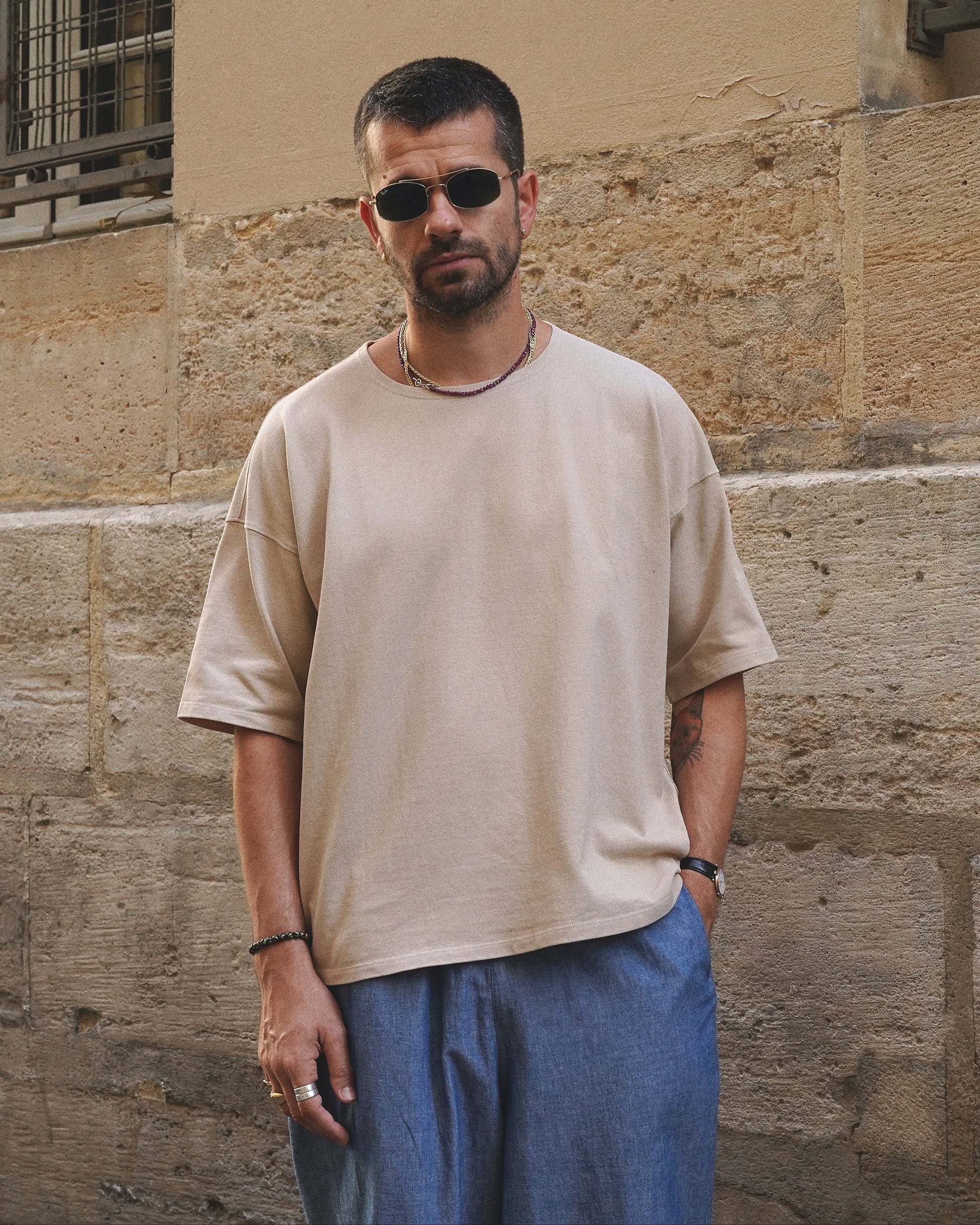 The Easy-T is our first top, drawing inspiration from the classic T-shirt, the Russian sailor shirt, and the polo. It features a generous cut — somewhere between loose fit and oversized — with carefully balanced length and drop-shoulder construction, designed to be worn just as easily with our high-waisted jeans as with wide-leg trousers for a more relaxed look.