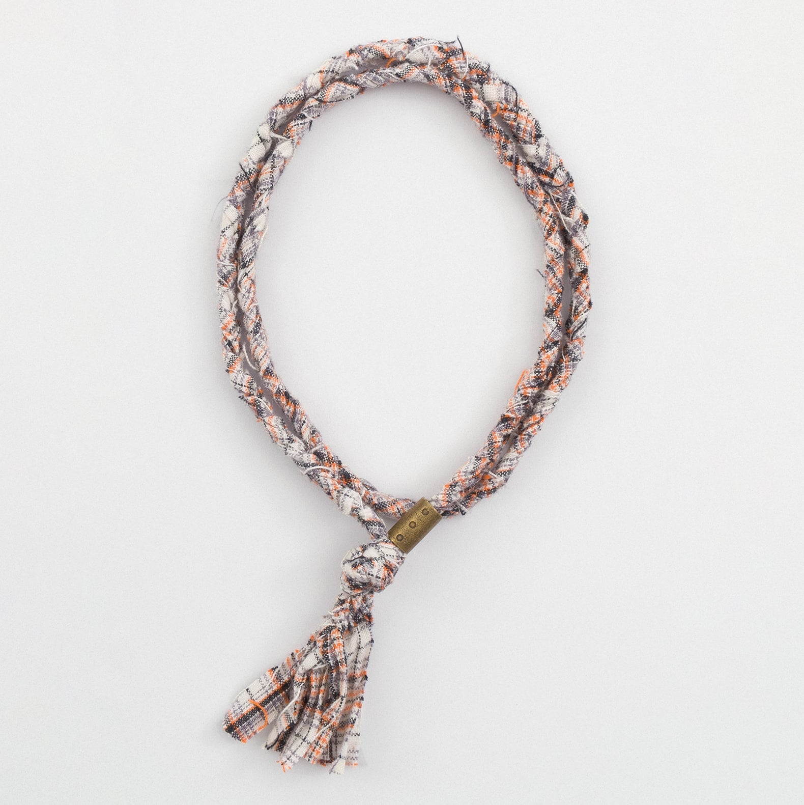 This necklace was hand-braided in Paris from a white, grey and orange cotton check shirt. The brass ring, shaped and distressed by hand, is engraved with our signature three dots.