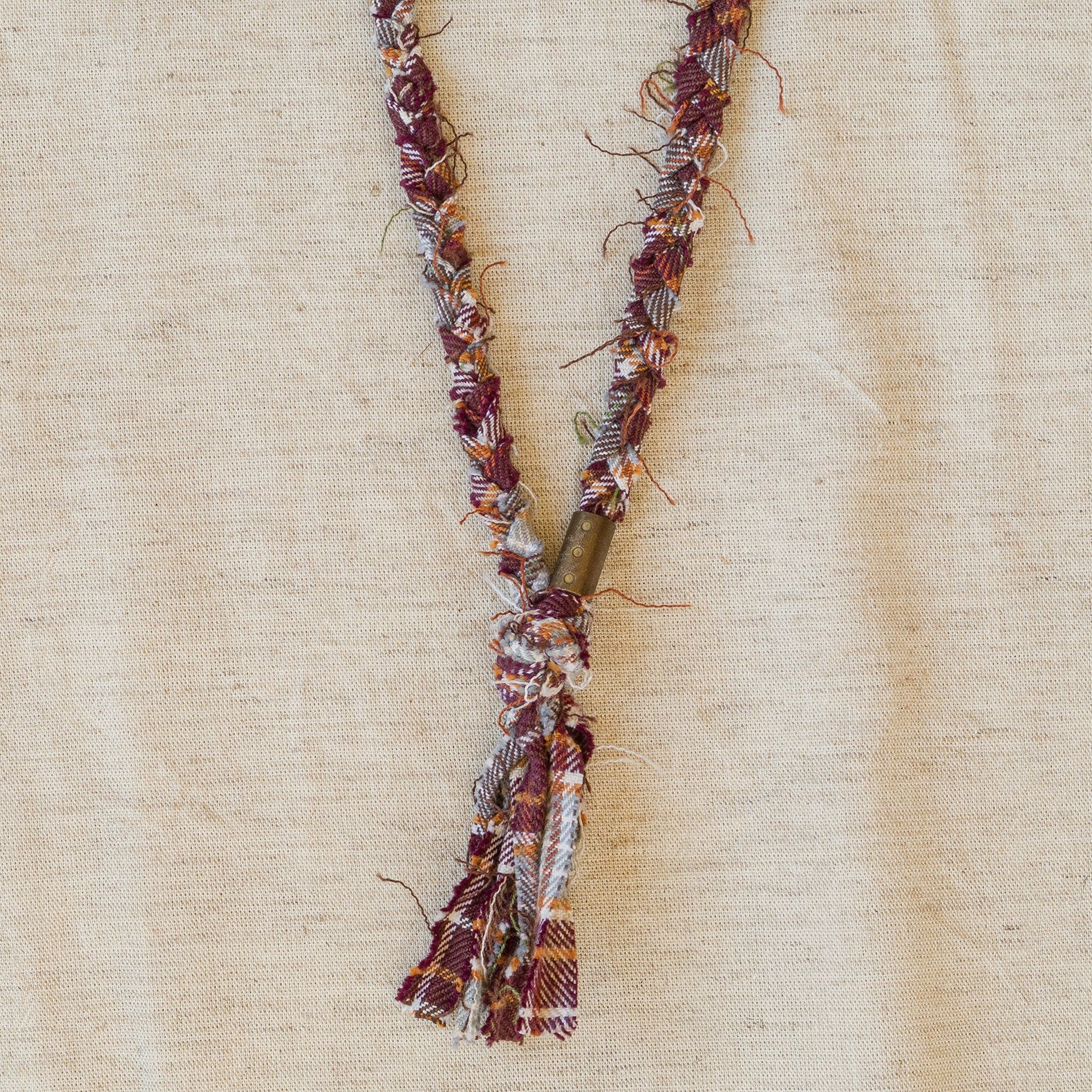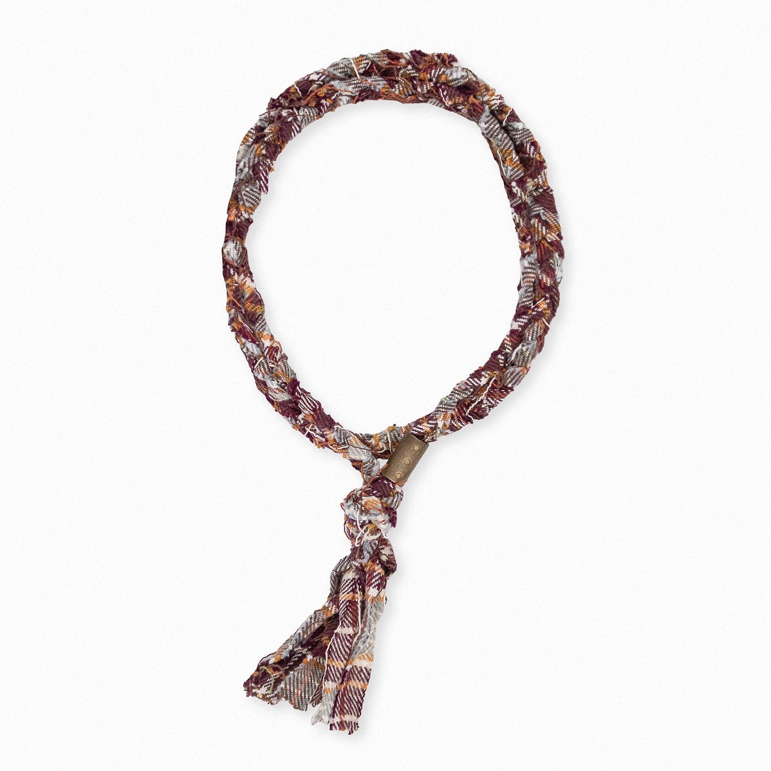 Ce collier est tressé à la main sur Paris à partir d'une chemise en flanelle de coton lie de vin, gris, orange et blanc.